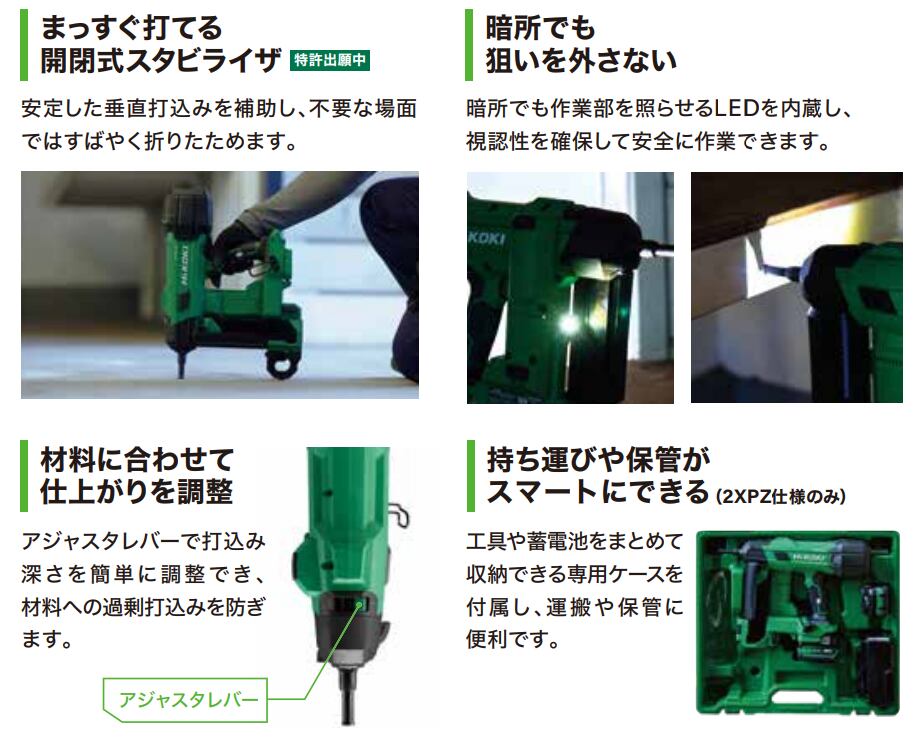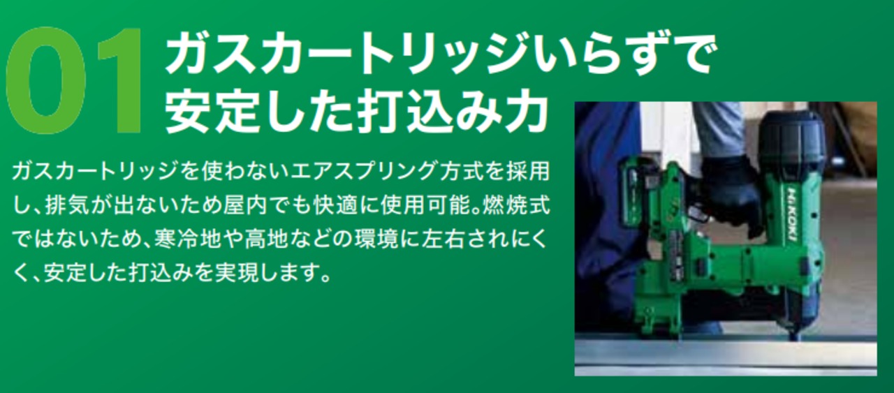 ガスカートリッジを使わないエアスプリング方式を採用し、排気が出ないため屋内でも快適に使用可能。燃焼式ではないため、寒冷地や高地などの環境に左右されにくく、安定した打込みを実現します。