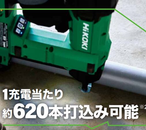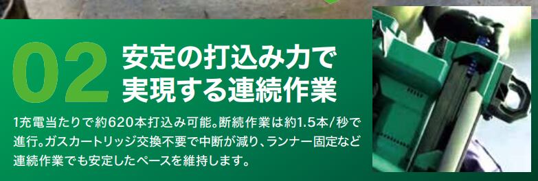 1充電当たりで約620本打込み可能。断続作業は約1.5本/秒で進行。ガスカートリッジ交換不要で中断が減り、ランナー固定など連続作業でも安定したペースを維持します。