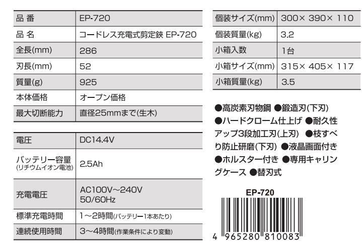 ARS コードレス充電式剪定鋏 EP-720 アルスコーポレーション