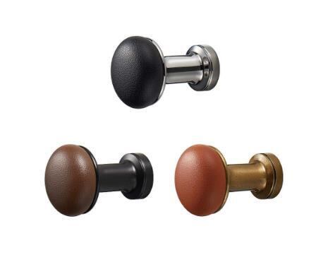 脱衣所などの水が掛かる場所でも使用できるように開発されたこのフックは、変色が心配される本物の革をあえて使用せず、金属に塗装を施して革のような質感を表現しています。
