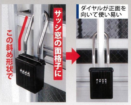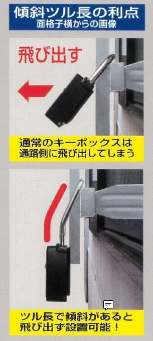 “キーストックMINI”のツルを長くした製品で、ツルをくの字に曲げたことで、面格子などに取り付けても本体は垂直に近づくよう設計されています。