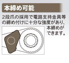 2段爪の採用で電路支持金具等の締め付けに十分な強度があり、本締めができます。